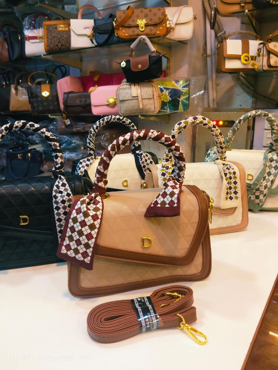 This beige-toned handbag features a soft quilted design with neutral contrast piping and a printed scarf handle. Lightweight, spacious, and versatile for daily use or casual outings.