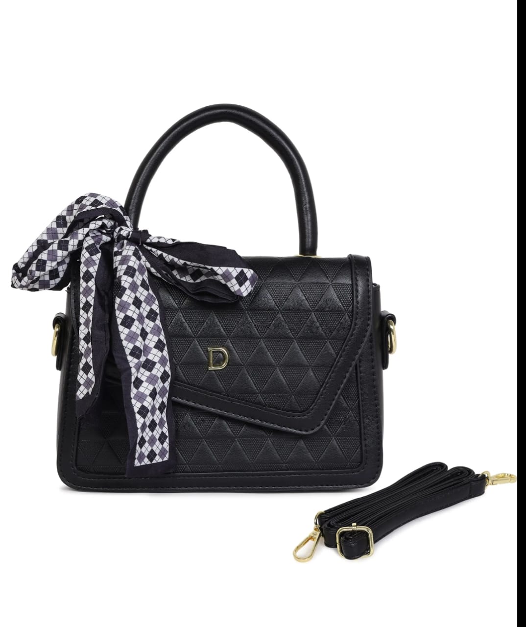 A timeless black quilted handbag with gold-tone detailing and a stylish scarf-wrapped handle. Comes with a detachable long strap, making it perfect for both hand-carry and crossbody wear. Ideal for everyday elegance.