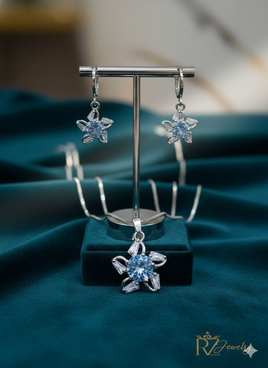 Delicate silver-tone floral set with soft light-blue crystal stones. Stylish, fresh, and lightweight.