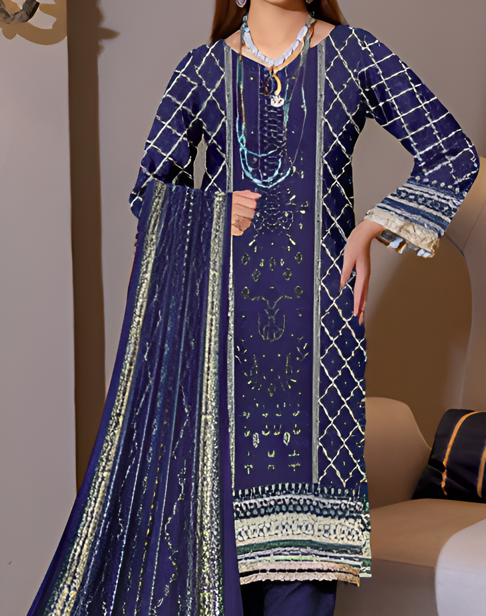 Stylish navy blue 3-piece unstitched suit featuring elegant geometric and traditional motifs in soft green and white tones. Paired with a matching printed chiffon dupatta and straight trousers, this outfit blends sophistication with contemporary charm perfect for semi-formal and festive wear.