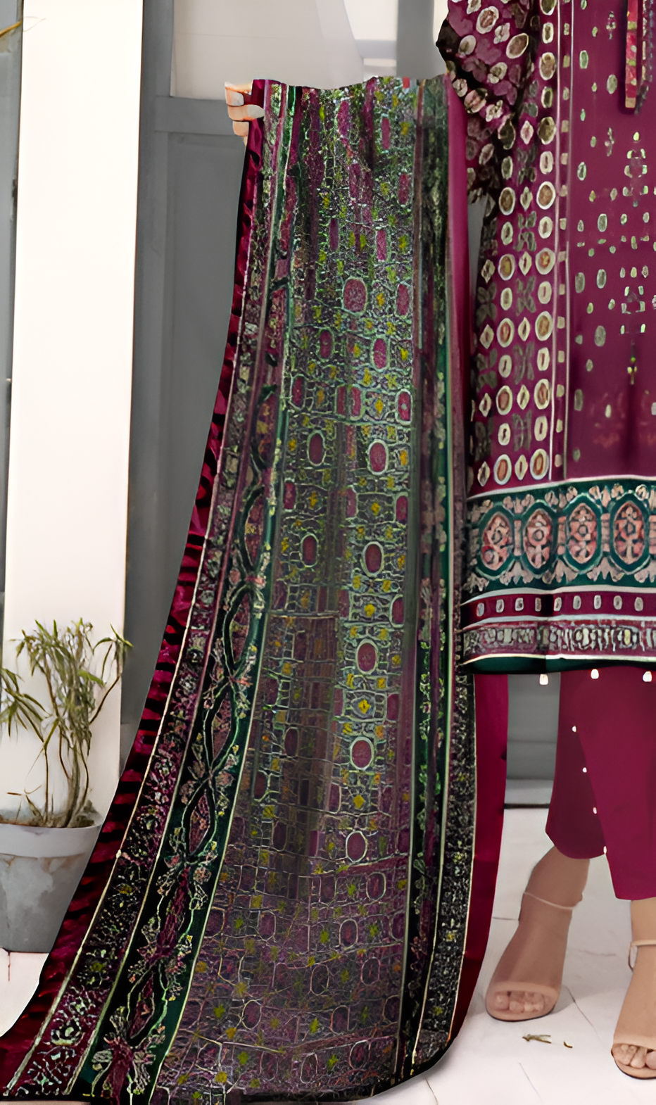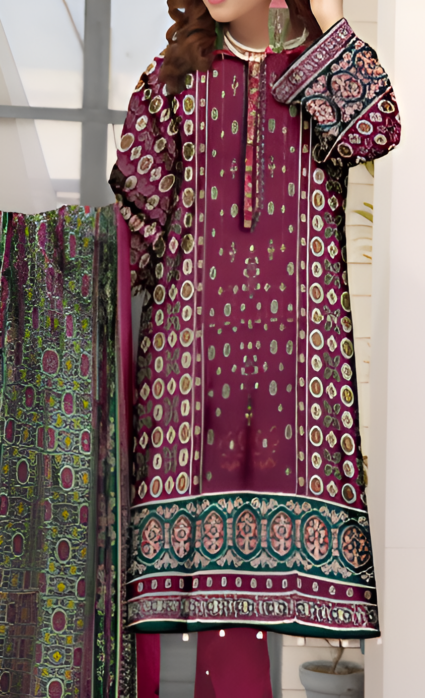 Vibrant magenta 3-piece unstitched suit featuring intricate ethnic-inspired prints in shades of green and beige. Paired with a beautifully patterned dupatta and matching solid trousers, this ensemble combines traditional artistry with modern elegance  perfect for festive and casual wear alike.