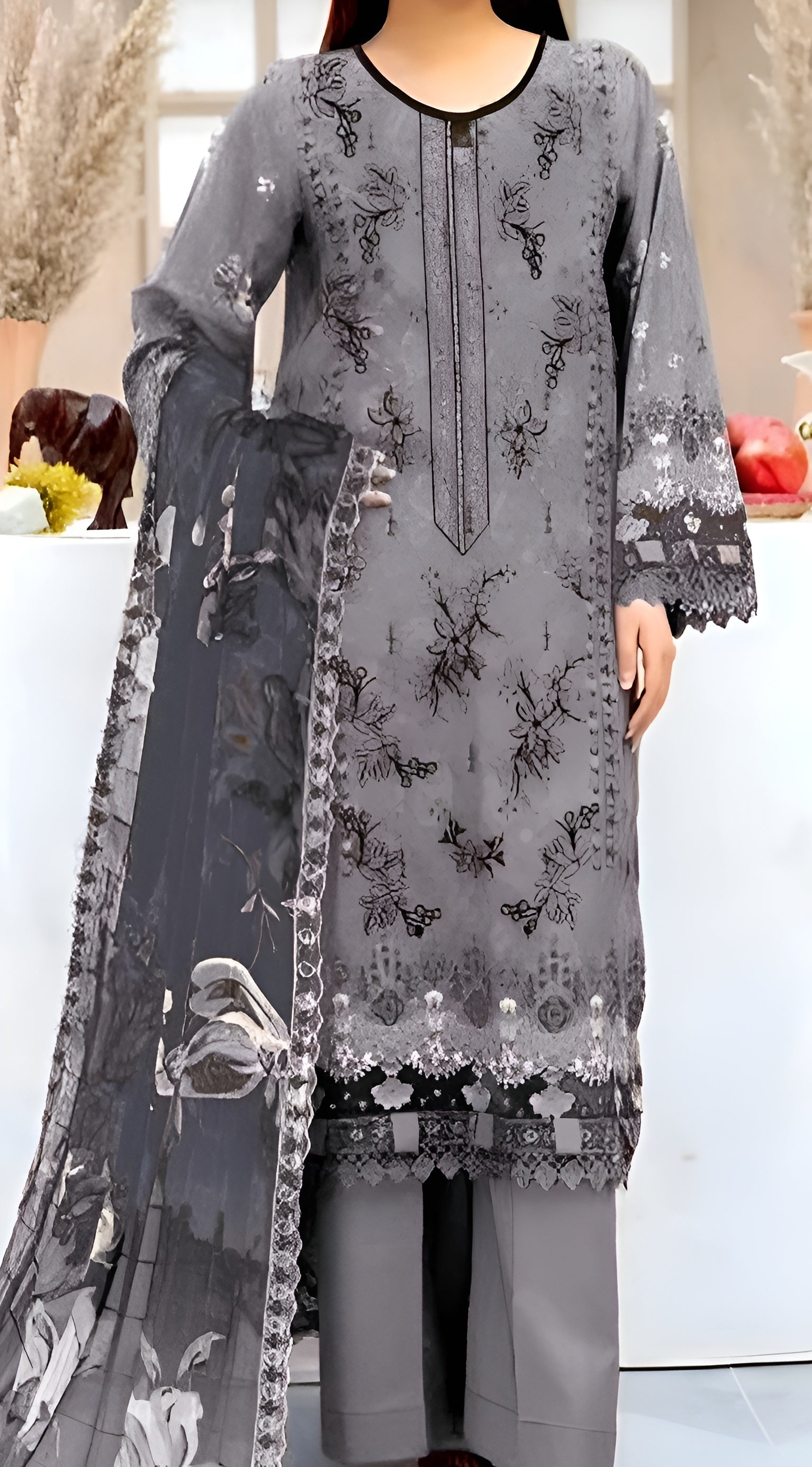 Elegant grey 3-piece unstitched suit featuring intricate floral embroidery on the front and sleeves, paired with matching straight trousers and a printed chiffon dupatta. Perfect for semi-formal occasions, offering a graceful and modern traditional look.