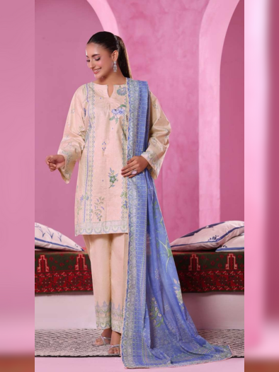 Ivory cambric suit with soft digital floral prints and a contrasting blue printed dupatta. From Alzohaib Coco Printed Cambric Vol 2, this unstitched 3-piece digital set is available online only (10 pcs per set).