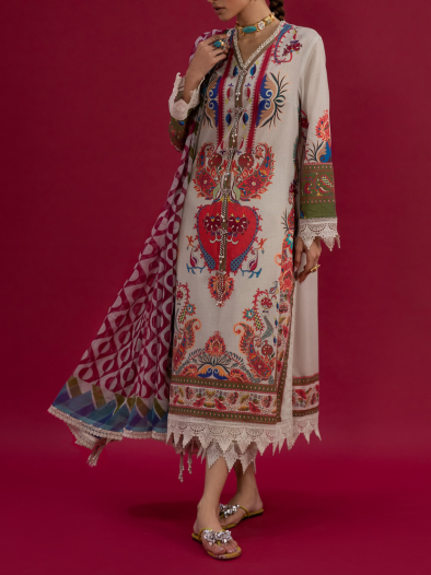 A luxurious 3-piece featuring a digital printed lawn shirt in elegant ivory with vibrant artistic motifs, paired with dyed cambric trousers and a beautifully patterned digital printed voile dupatta. Bold colors and detailed borders create a premium, statement look.