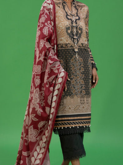 A graceful 3-piece ensemble featuring a luxury digital printed lawn shirt in beige and deep noir tones, paired with dyed cambric trousers and a rich maroon digital printed voile dupatta. Detailed patterns and elegant contrasts give it a refined, premium look